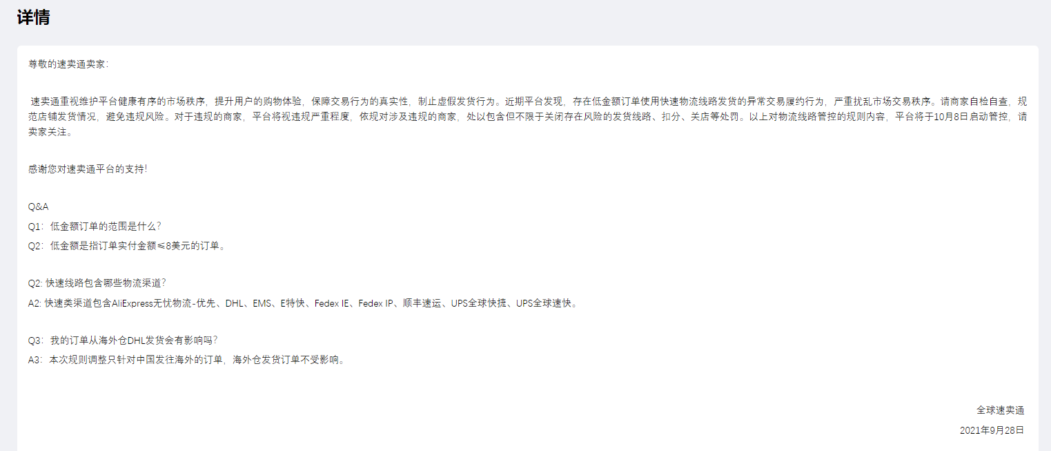 在了解速賣通刷單的必要性和方法之前,速賣通賣家首先有清晰的認(rèn)知,外包第三方刷單公司補(bǔ)單必死無(wú)疑,就是在2021年10月8號(hào)開始,速賣通平臺(tái)就發(fā)布了相關(guān)的公告。下面,eGoBest給大家分享為什么給第三方刷單公司刷單很不安全。