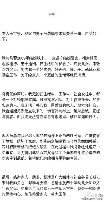 8月14號凌晨,王寶強(qiáng)發(fā)布了一條與妻子馬蓉離婚微博,其實娛樂圈中明星公開分手或離婚的戲碼也不少,但王寶強(qiáng)這一公開自己離婚的微博卻引起了軒然大波,瞬間引起25萬跟評,原因或許就在于王寶強(qiáng)在微博中直爆離婚內(nèi)幕、直斥妻子的惡劣行為,言語義正言辭。